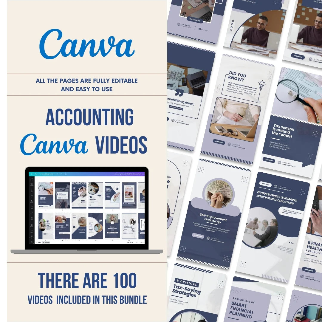 Elevate your digital presence with our "100 Accounting Video Templates Bundle," meticulously designed for accounting professionals. This collection of 100 Canva templates is crafted to captivate, educate, and engage your audience by demystifying complex accounting principles.
