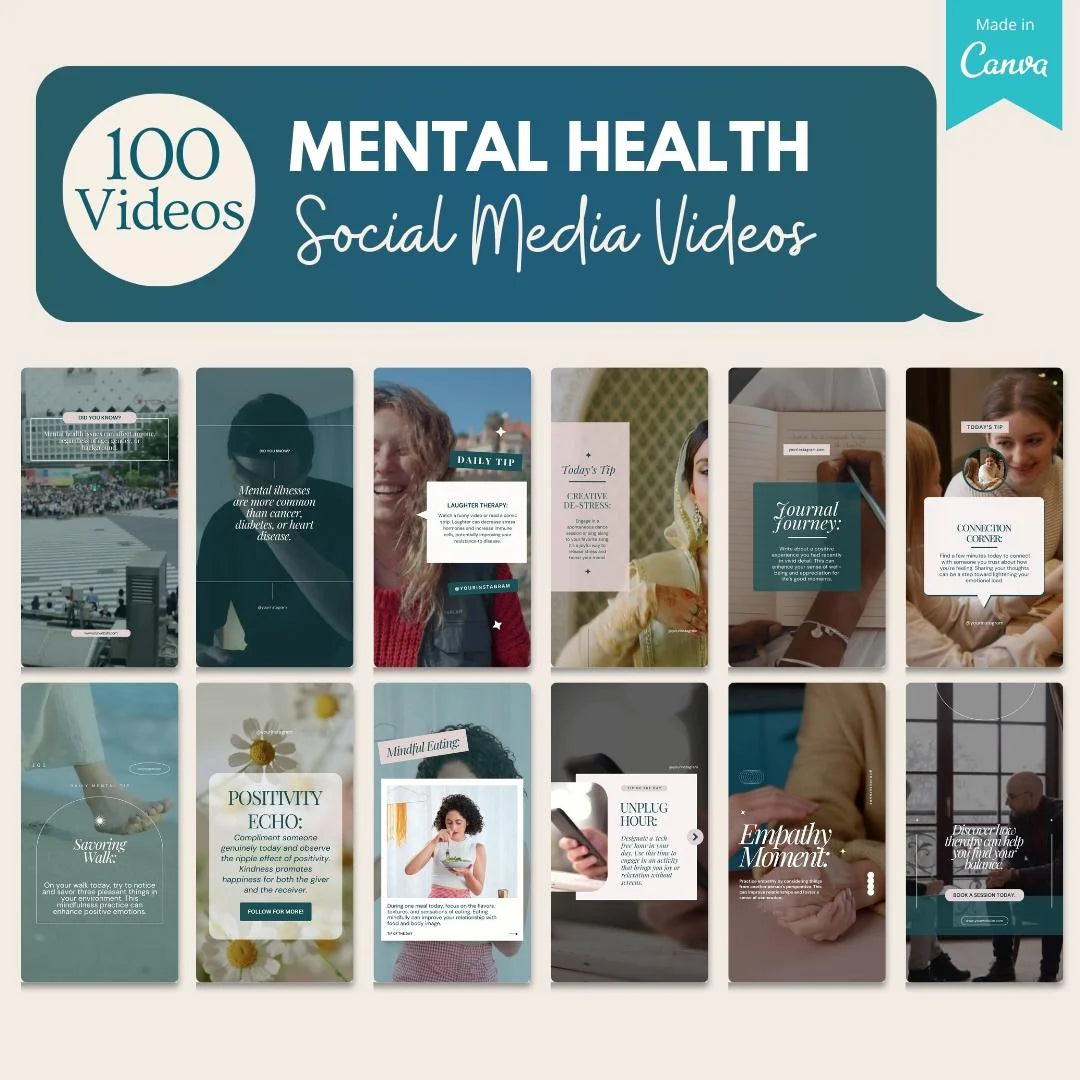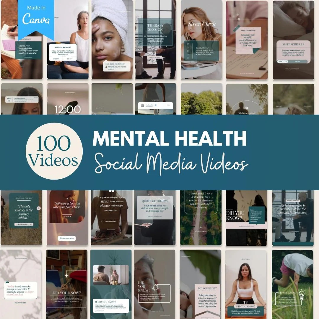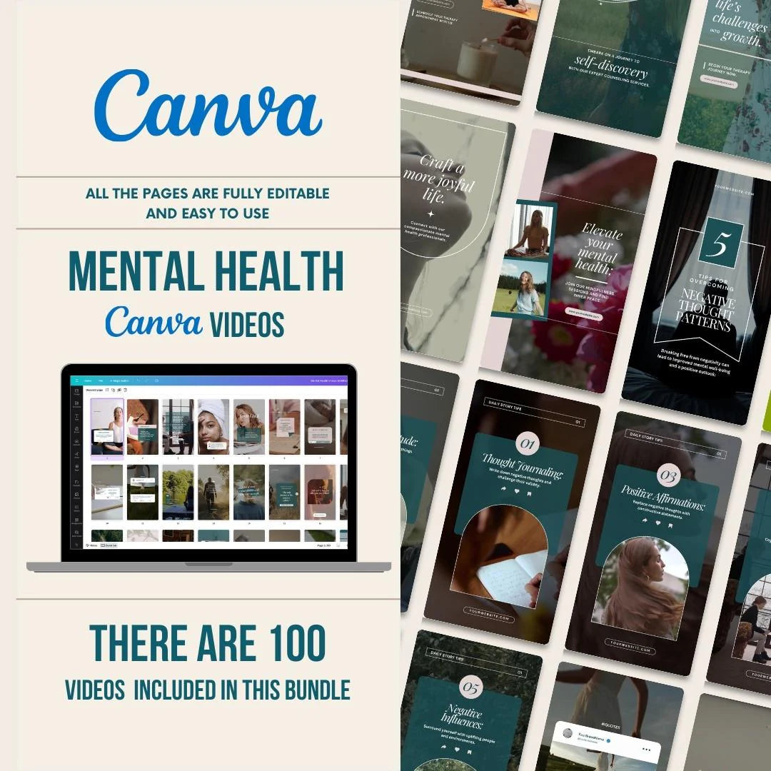 Elevate your digital presence with our comprehensive Mental Health Video Templates Bundle, tailored specifically for mental health professionals. This unique collection of 100 Canva templates offers a diverse range of video content, meticulously crafted to engage, inform, and support your audience's mental wellness journey.