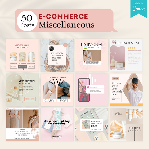 ✅️ eCommerce Miscellaneous - 50 Templates: Share various eCommerce content such as customer testimonials, behind-the-scenes, and other engaging posts that build a strong connection with your audience. 🎉🛍️💭