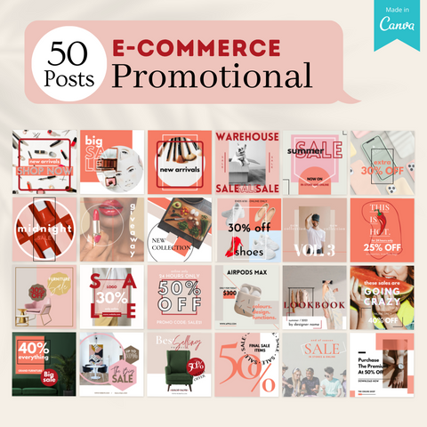 This comprehensive bundle includes 200 fully customizable Canva templates, ingeniously designed to help you create captivating and engaging social media content that reflects the appeal, variety, and quality of your online merchandise. Share compelling CTAs, showcase your product categories, share miscellaneous eCommerce content, and exciting promotional posts to draw in your audience and emphasize the quality and benefits of your online store. 🎨💡📈