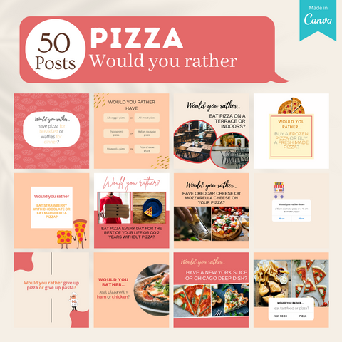 ✅️ Pizza Would You Rather - 50 Templates: Share fun and enticing "would you rather" scenarios that involve different pizza types, toppings, and pizza eating situations. Engage your audience in an interactive way. 💡🍕🌍
