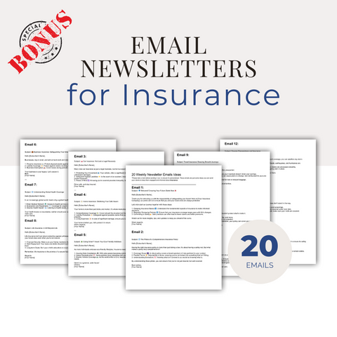 🎁 BONUS: 20 Weekly Newsletter Emails for Insurance: Stay engaged with clients through meticulously drafted newsletters, ideal for sharing updates, tips, or new offerings.