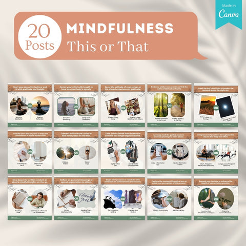 🔄 Mindfulness This or That - 20 posts: Interactive and fun comparisons to get followers thinking about their mindfulness preferences and habits.