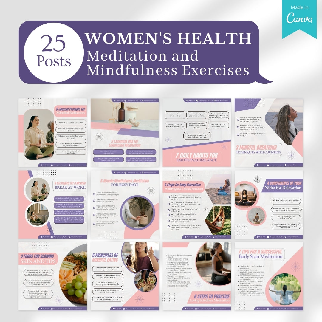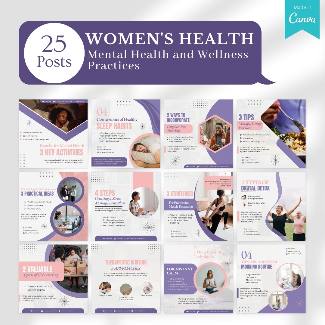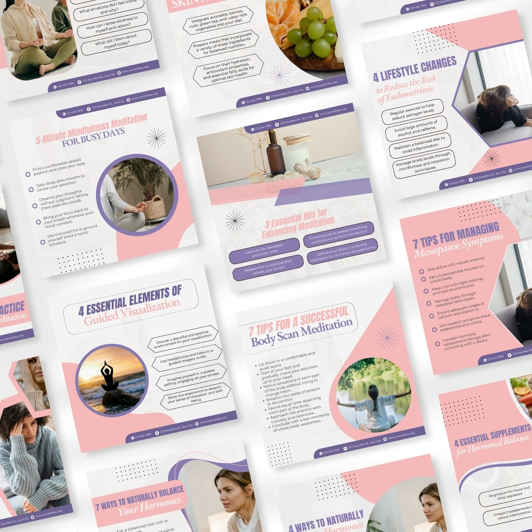 Perfect for professionals dedicated to promoting women's health and wellness, this bundle ensures you're equipped to cover a wide spectrum of topics. From reproductive health and menopause to fitness, self-care, and nutrition, these templates allow for deep customization to fit your unique message and branding. 🧑🏫🥦🏃♀️