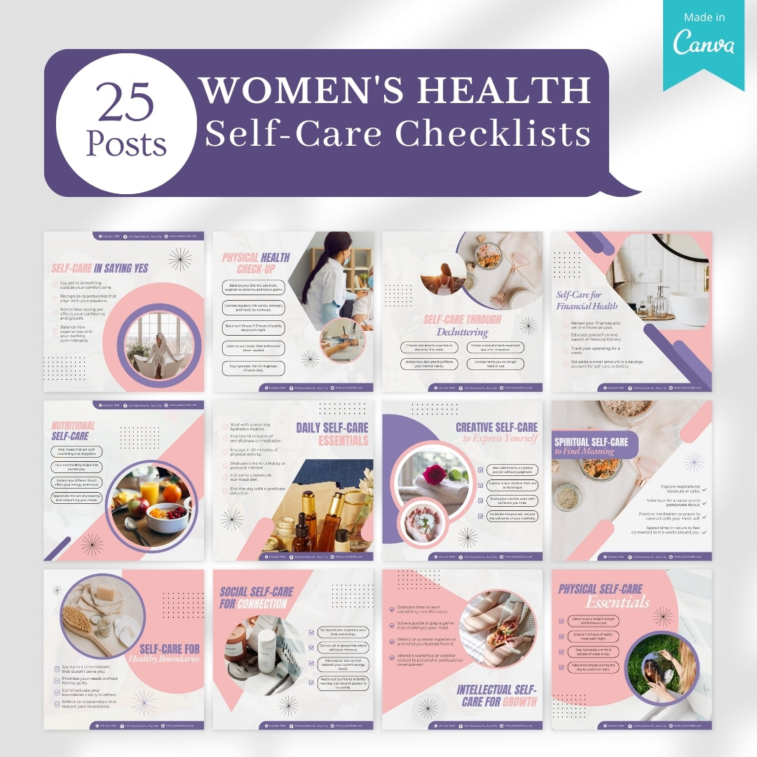 📝 Women's Health - 25 Self-Care Checklists: Reminders for personal time and self-nurturance.