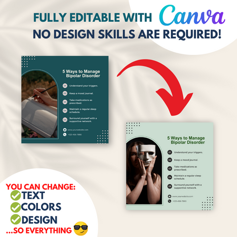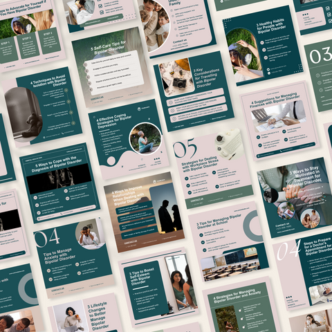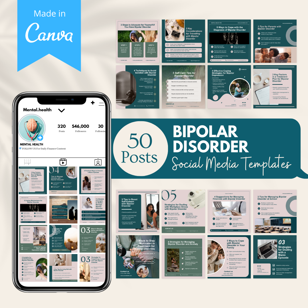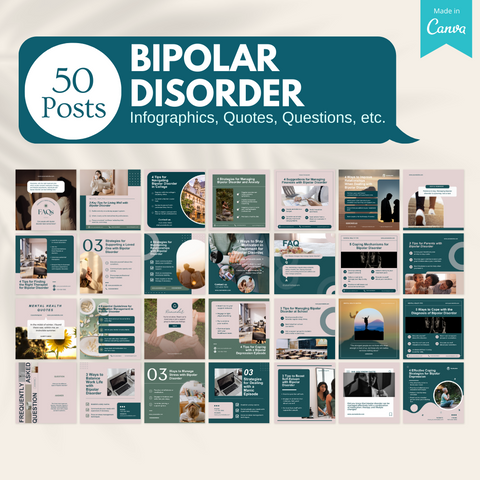 ✅️ **Bipolar Disorder - 50 Canva Templates** 🖼️: Dive deep with templates containing infographics 📊, quotes 💬, questions ❓, and more. Engage and educate your audience 🧠, shedding light on the complexities and realities of bipolar disorder. 🌌🔍