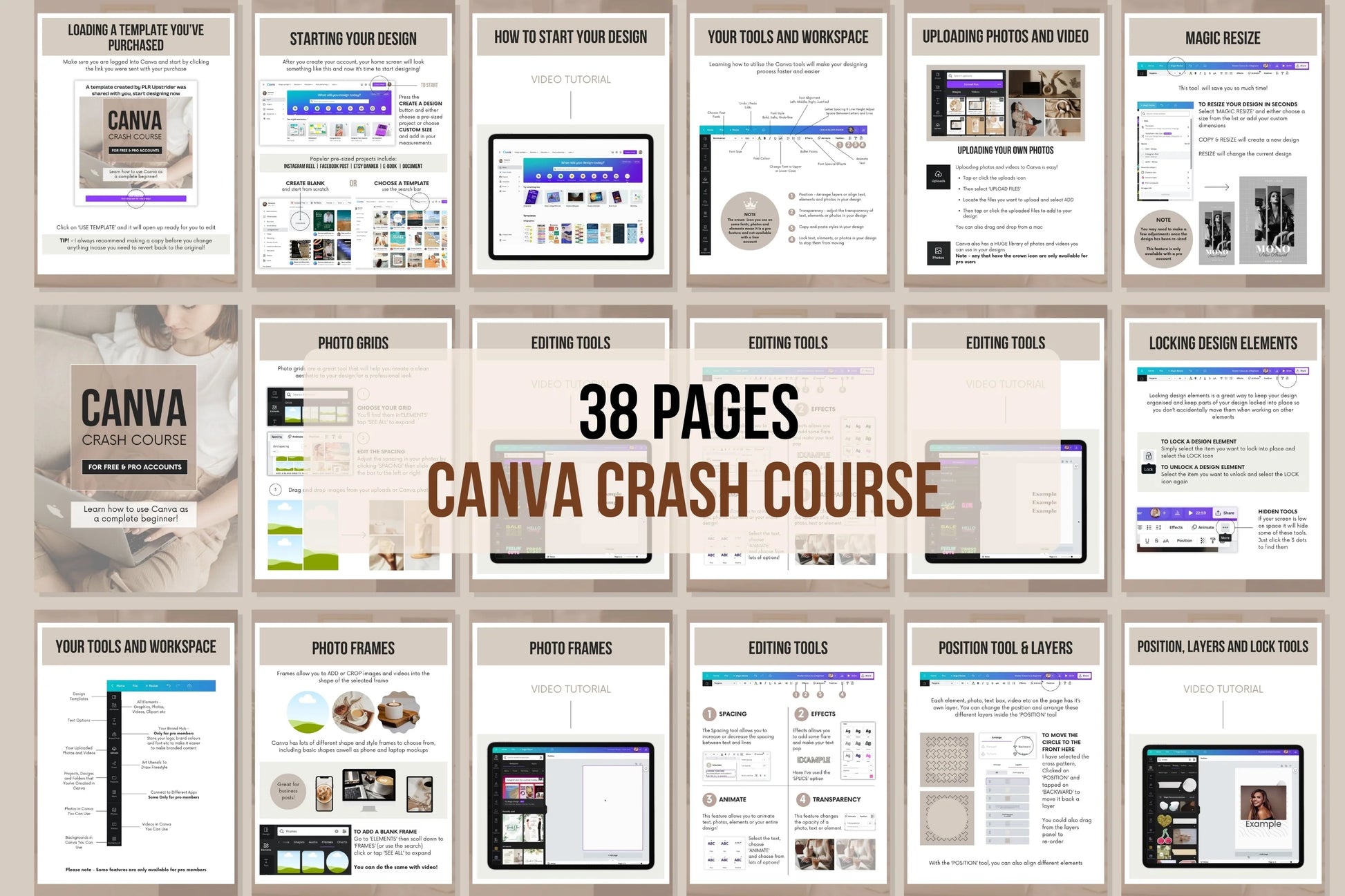 Embark on your design journey with our comprehensive "Canva Crash Course - 38 Pages." This meticulously crafted guide is perfect for beginners and seasoned users alike, looking to unlock the full potential of Canva. Through 38 pages of expert advice, detailed explanations, engaging visuals, and helpful videos, you'll explore the ins and outs of Canva, transforming your design skills from novice to pro in no time.