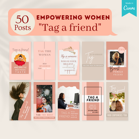 Our "Tag a Friend" templates are designed to foster a sense of community and support among your female followers. These 50 fully-editable templates encourage your audience to tag their friends, creating a ripple effect of empowerment and inspiration. Share these templates to help build a supportive and empowering online network. 🧑‍🤝‍🧑💃💡