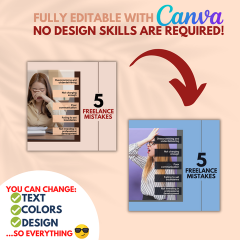These templates cover a wide range of topics related to freelancing, including infographics 📊, "This or That" posts 🅰️🅱️, and FAQs ❓ to help your audience navigate the world of freelancing with confidence 💼🌍.